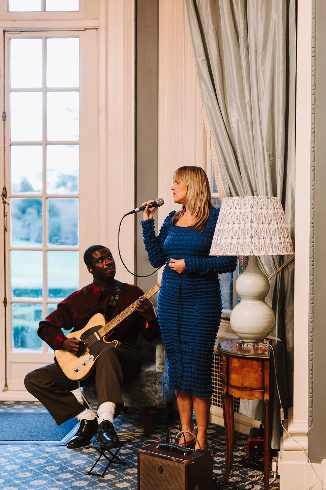 As Simeon and Kathryn left the Centre Hall together, now officially husband and wife, the guests were encouraged to enjoy some live music and drinks next door in The Drawing Room with floor to ceiling doors opening onto the sunny South Lawn.